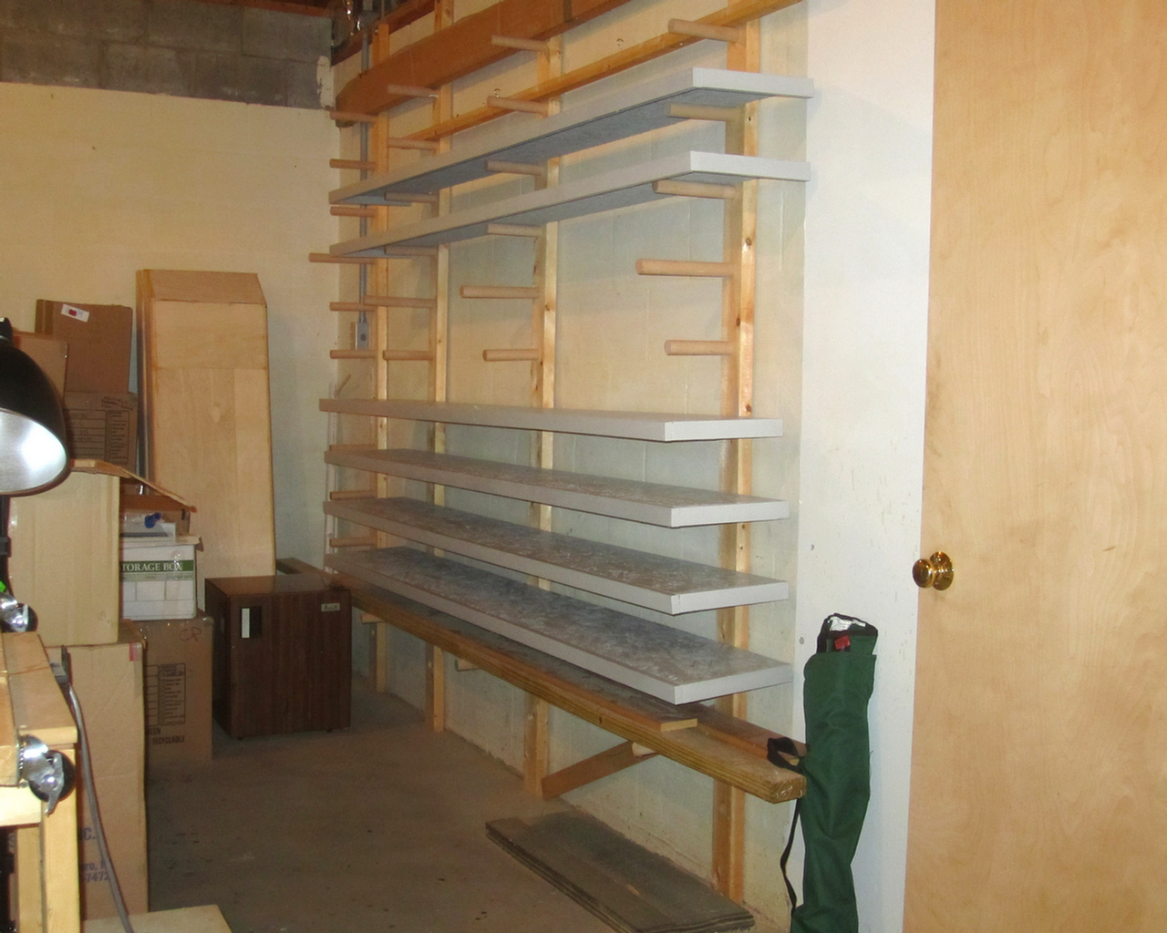 Removed all the existing short dowels and cut new ones that fit the depth of the shelves. That left me with a bunch of round kindling for this winters fires in the fireplace. I also spaced the dowels to better fit my anticipated needs. Made a double deep one for the top.