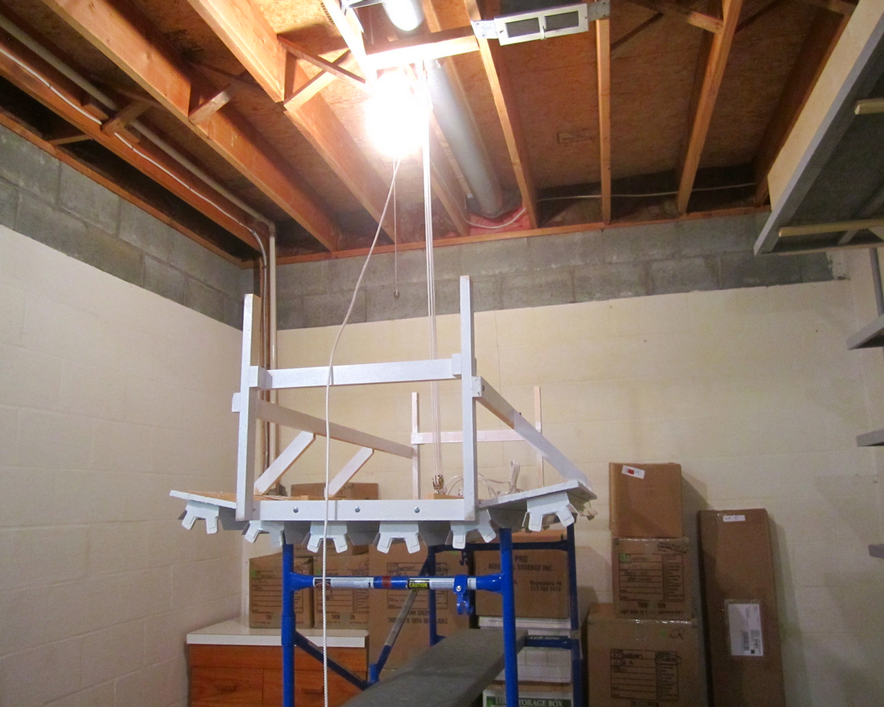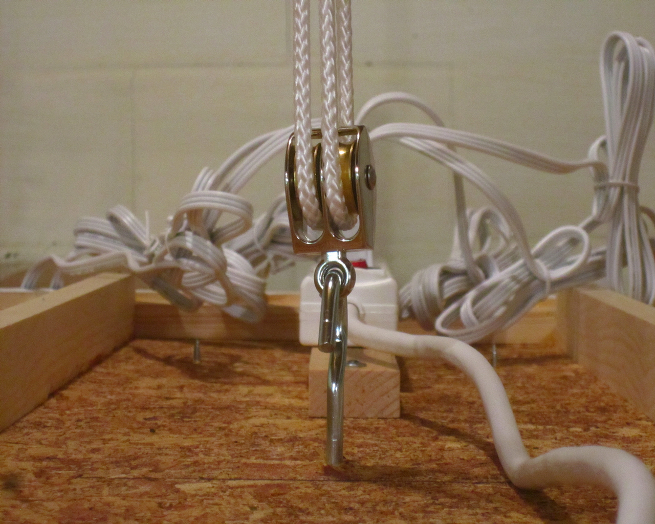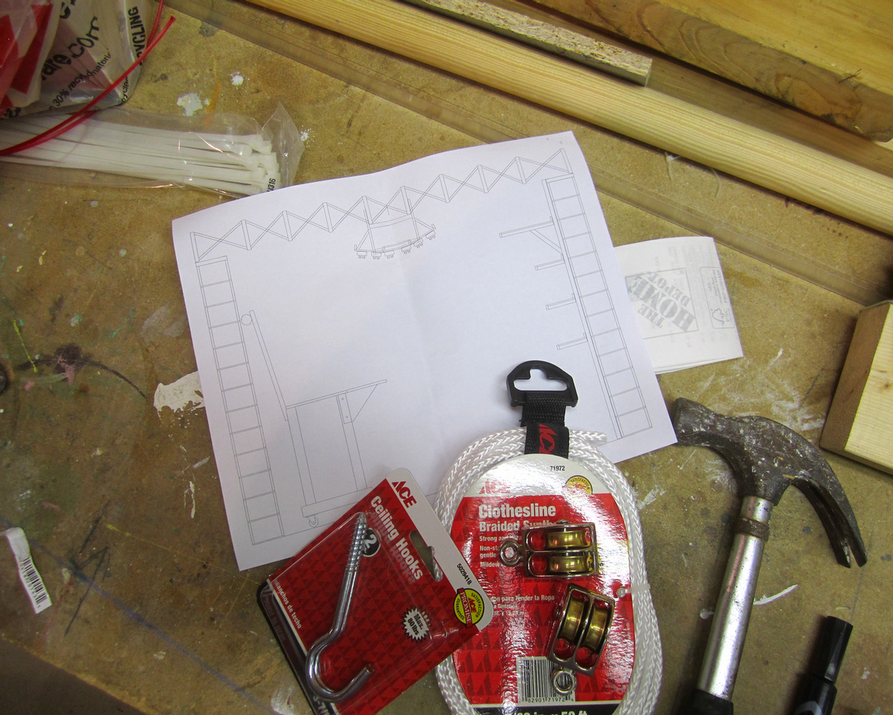 I'm a crane guy, so certainly I should be able to figure something out. A couple of two sheave pulleys, some hooks, and rope to lighten Wifey's load. Hey! someone has to operate the dangerous nail guns and power screwdrivers. That be me.