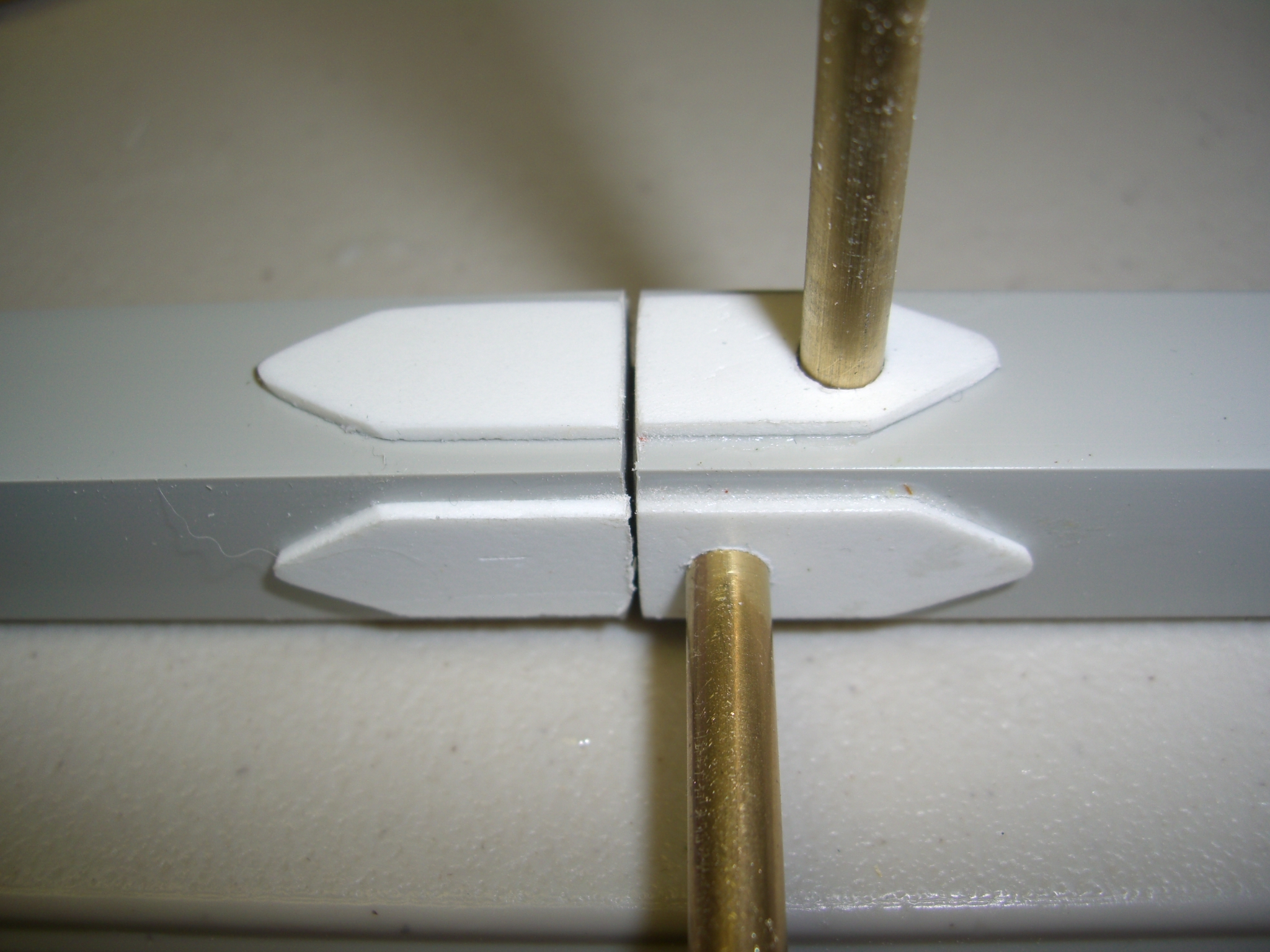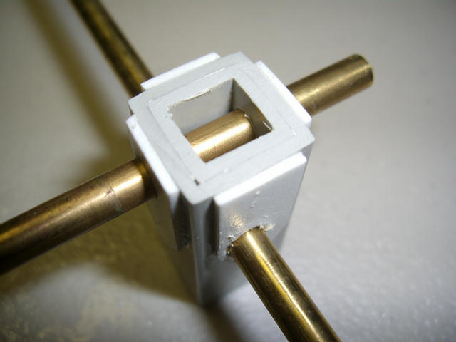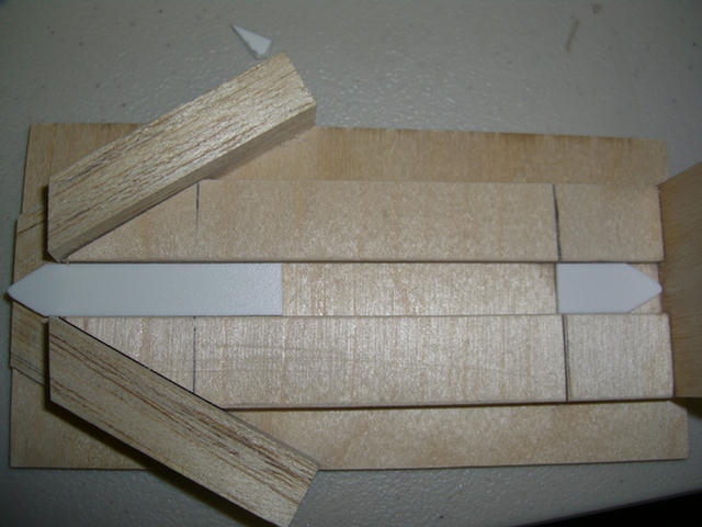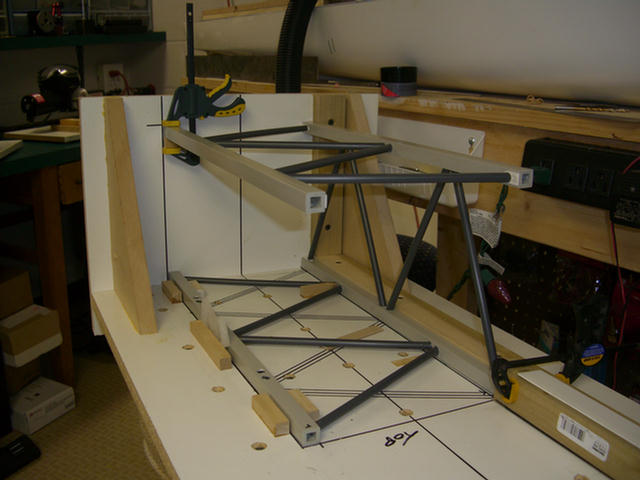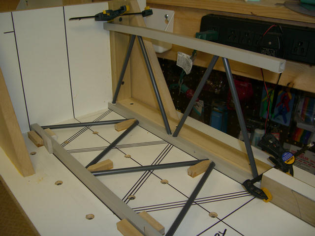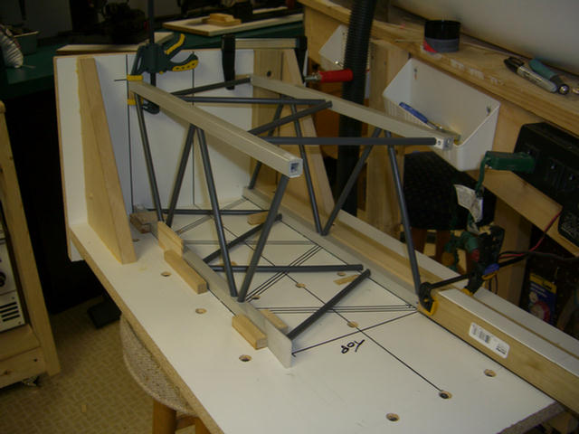 The jig will require a space left on each face of the main chords. Here, spacers are being inserted and glued to the jig.