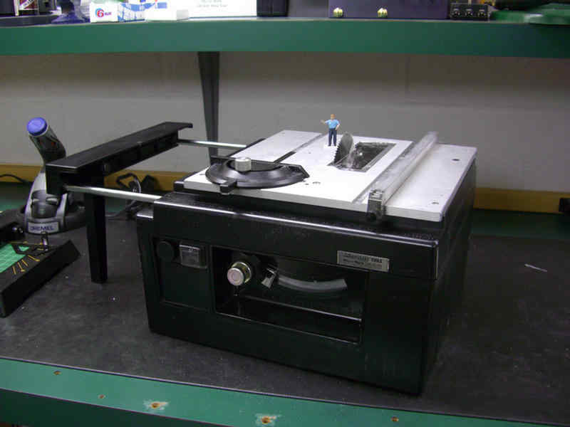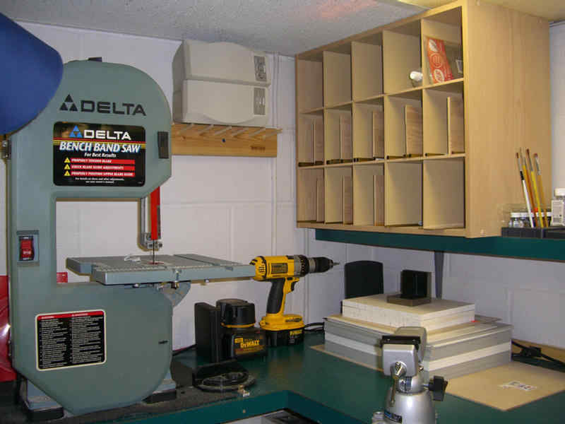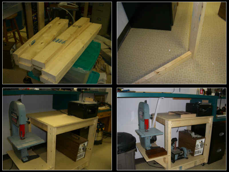 Okay, the bomb and the Bud-Light have been replaced by a roll out table to contain the table saw, the band saw, the belt sander, and the compressor. When I need the band saw or the belt sander, I just place them on the table top for use. They store nicely out of the way when not needed.